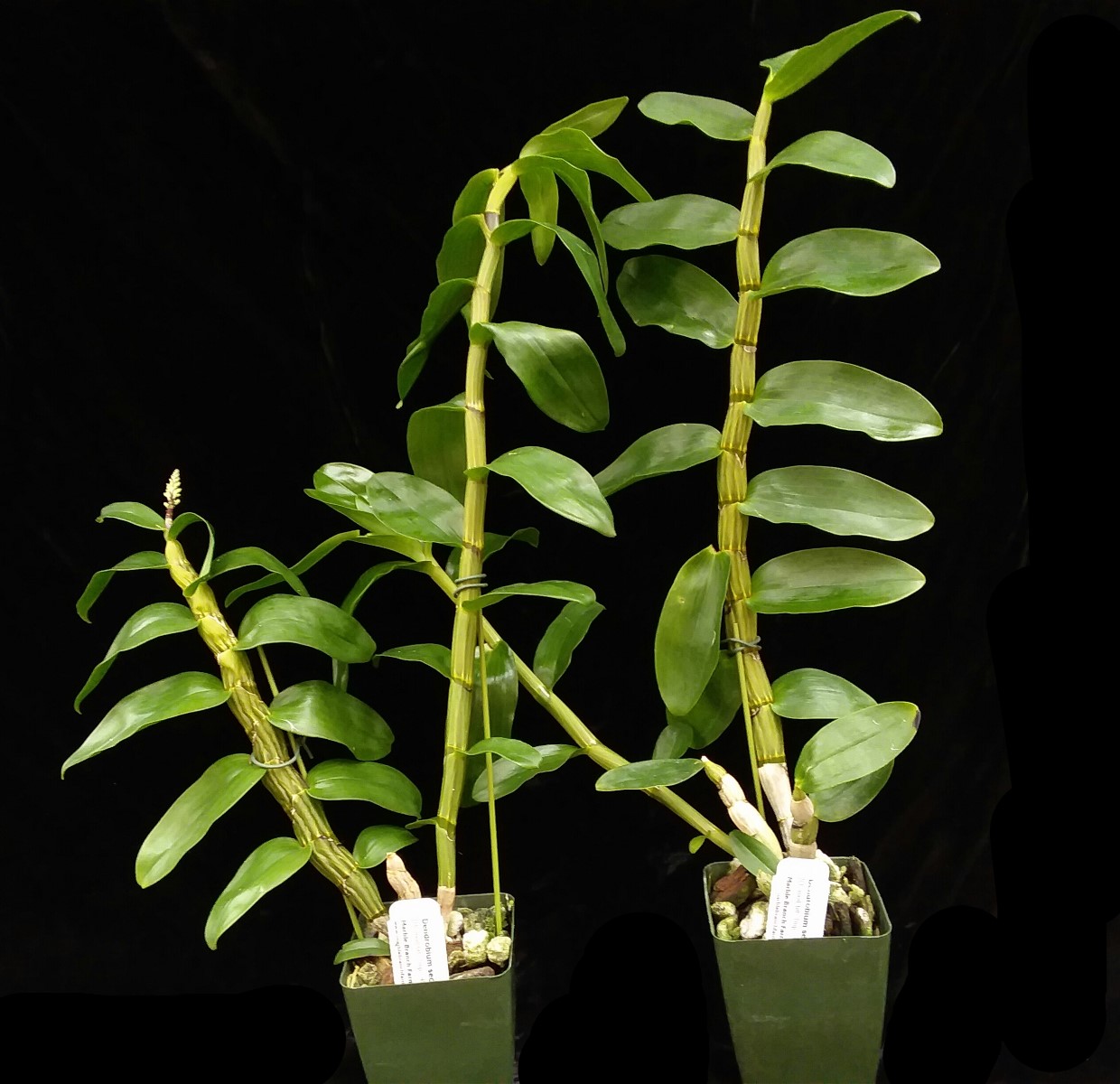 New! This intriguing species is found throughout Southeast Asia, Indonesia, Borneo and the Philippines in forests that are wet in summer, but very dry in winter. The spikes of pink to bright purple flowers emerge in late winter to spring, on leafless older canes, and sometimes in mid-summer near the tip of a recently matured leafy cane. The flowers have the unusual habit of all facing toward the upward side of the inflorescence, inspiring the common name in Indonesia that translates to “Toothbrush Orchid.” Each growth repeats flowering for several years, so mature plants can produce many flowers at once. There are numerous awards for plants carrying dozens of spikes and more than 1,000 flowers and older plants may flower more than once per year. Grow this orchid bright and very well watered from May through October, then gradually reduce watering in November and December. By winter, plants can stay dry for most part, with occasional light watering or misting to mimic dew and mist that might occur in the depth of the dry season in the wild. When new growths emerge from the base of the plant watering can be increased again. Den. secundum can tolerate a variety of temperatures from near freezing to 100F, but will flower even if kept above 60F year round. We are offering very nicely grown, near blooming size plants in 3.5” square pots with several nice canes. These plants have all reached blooming size now. Those that have flowered out of this batch have been rosy pink. In cultivation, canes on mature plants will average 12 to 18 inches in length, generally with an arching habit.